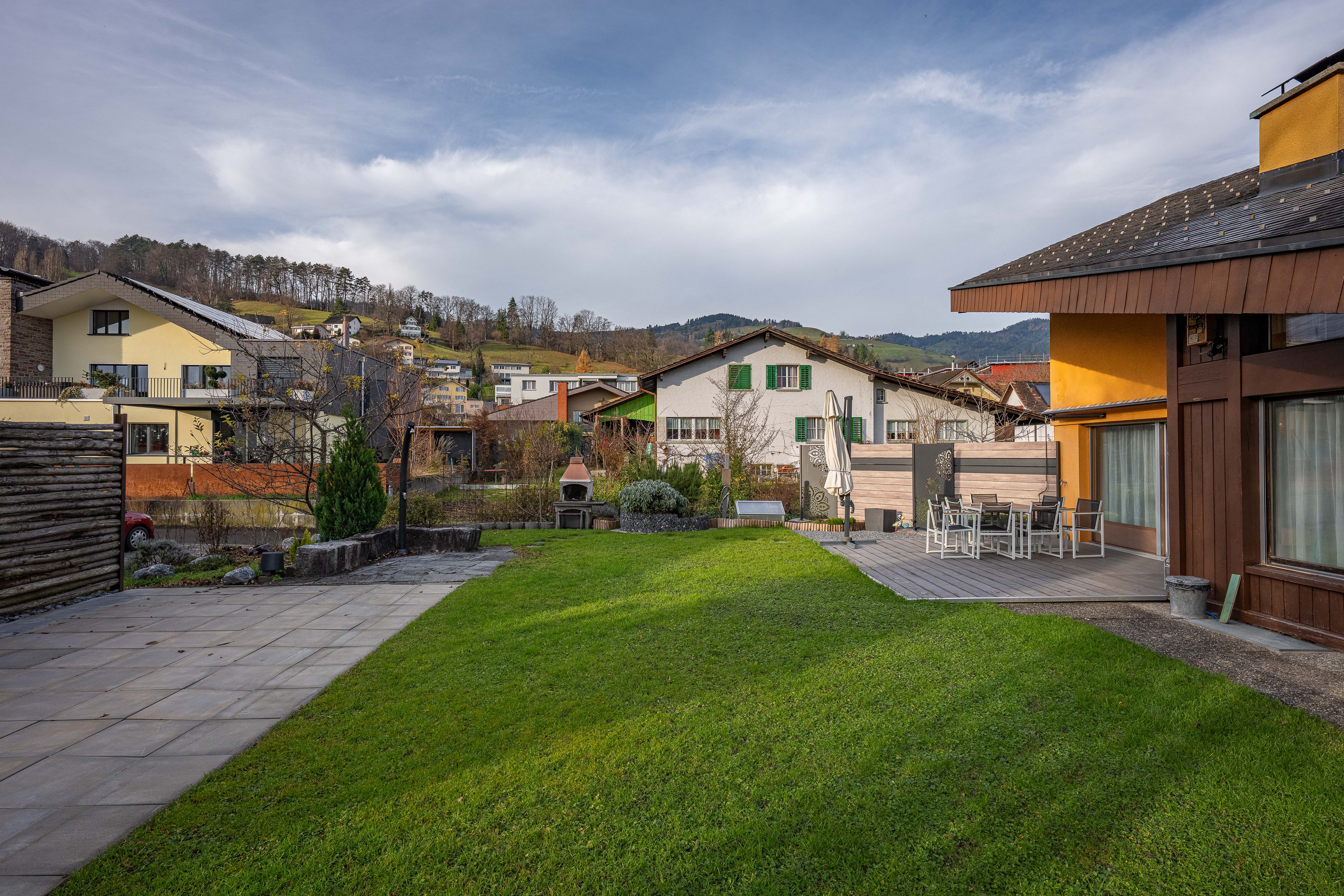 - Liebevoll gestalteter, terrassierter Garten mit Pergola, Sitzplatzbereichen, Aussencheminée, Rasenflächen und Bepflanzungen