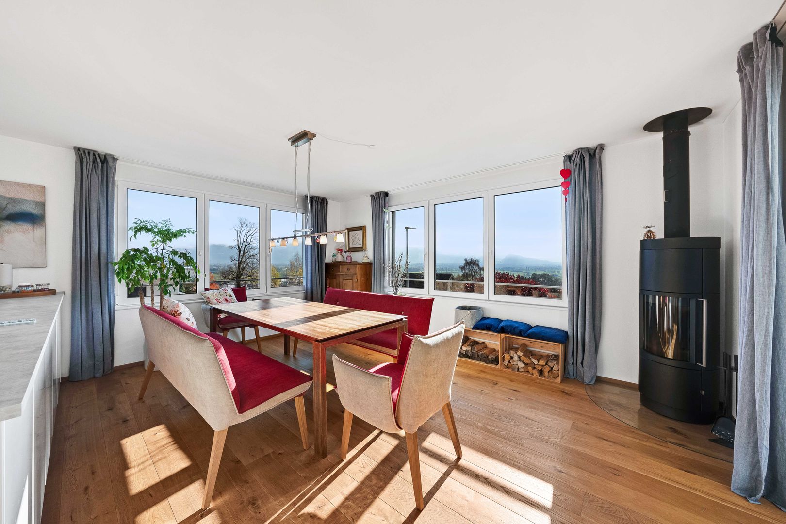 • Heimeliger, drehbarer Schwedenofen im Wohn-, Ess- und Kochbereich