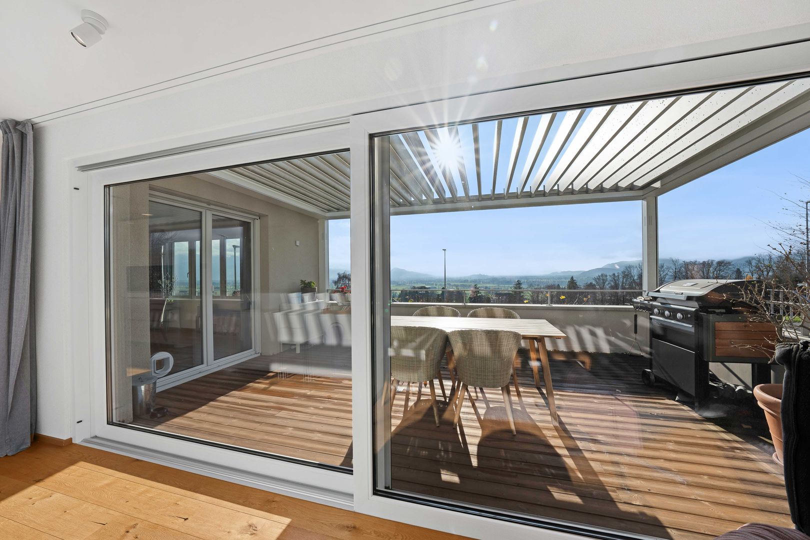 • Grosszügige Terrasse mit Lamellenüberdachung und Abgang zu Garten