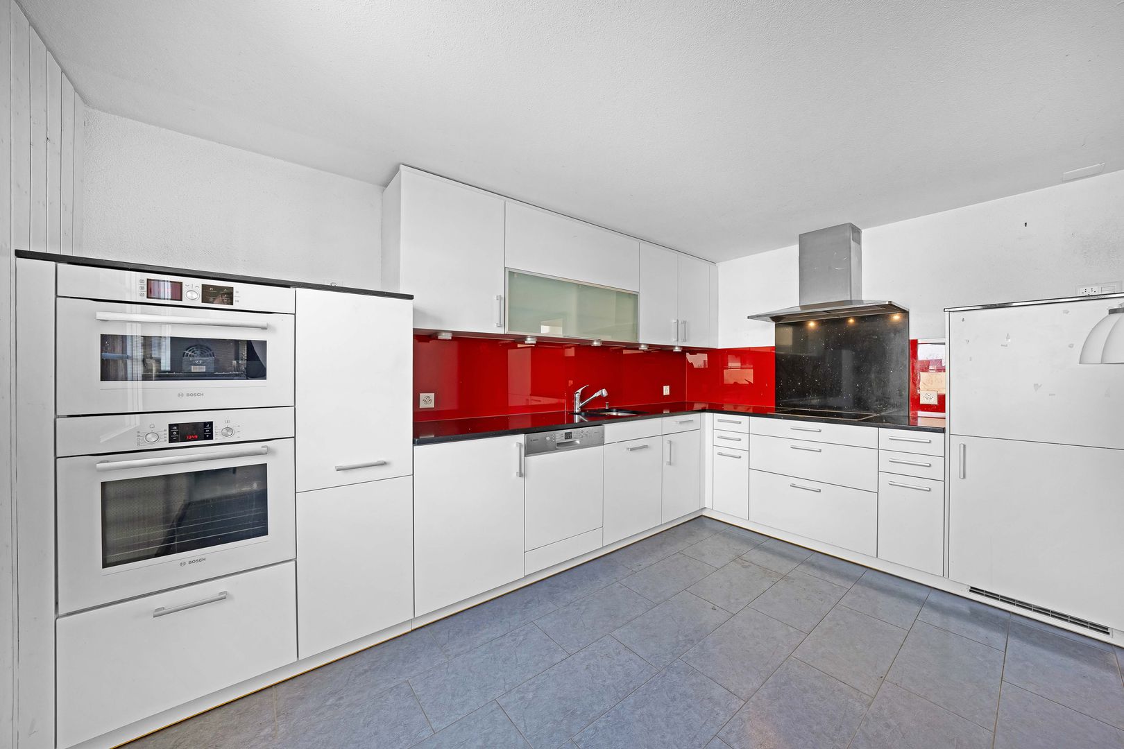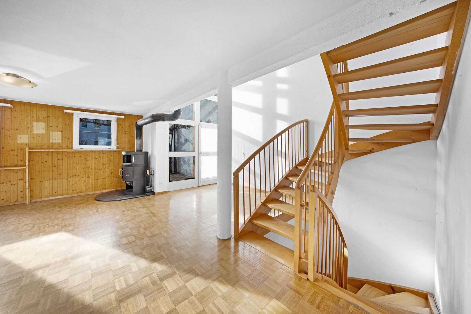 • Offener Wohn- und Essbereich mit Cheminéeofen und direktem Ausgang zu gedecktem Balkon
