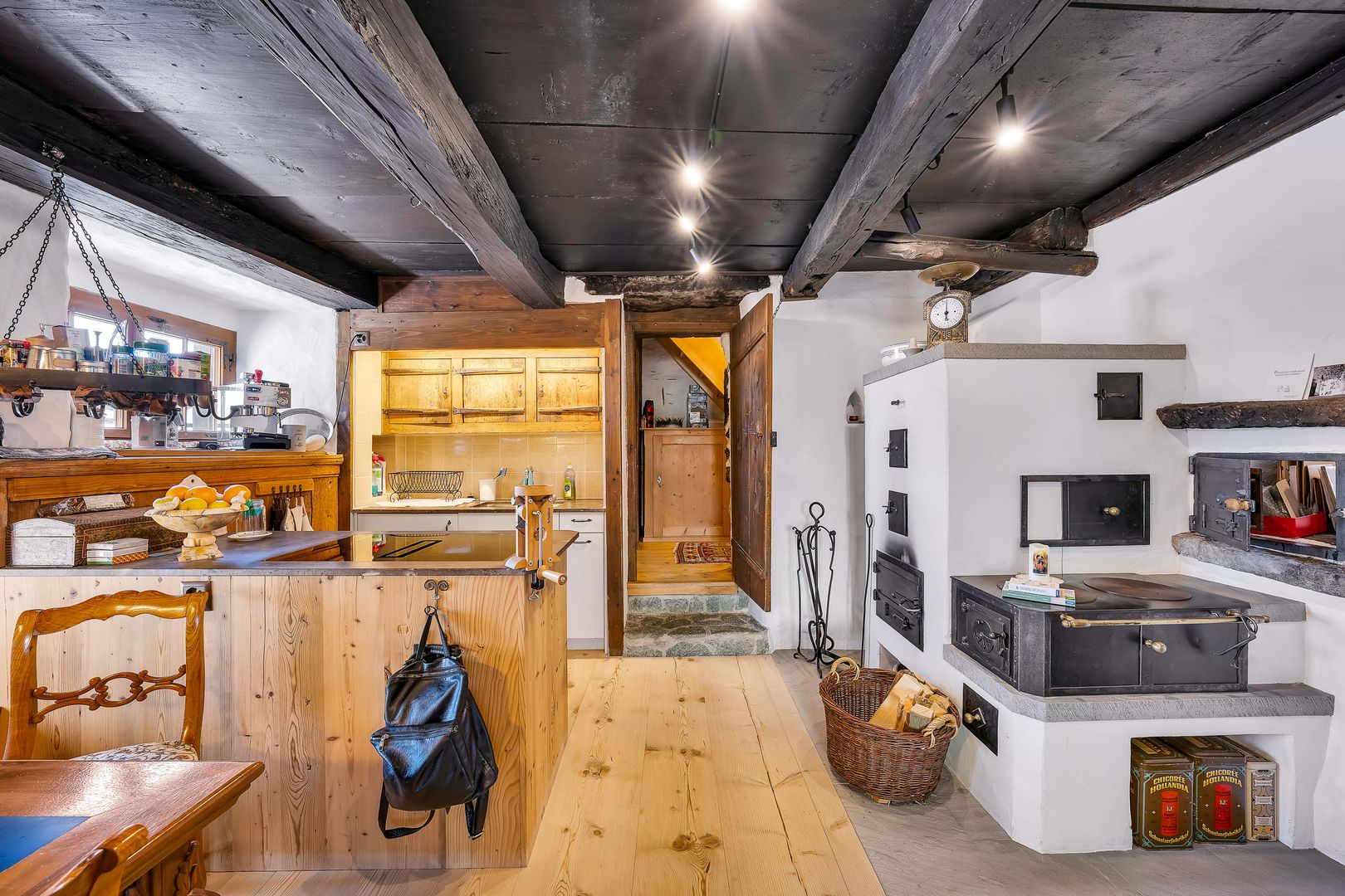 • Spektakulärer Holzofen mit Gusseisenherd im Ess- und Kochbereich sowie Schwedenofen im Wohnzimmer