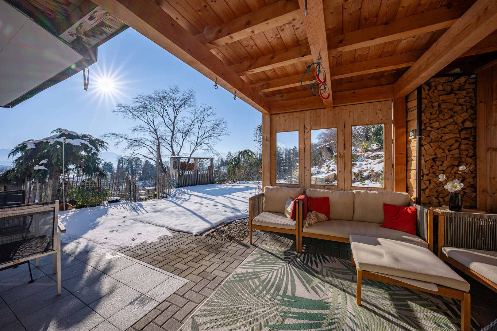 • Herrlicher Umschwung mit gedecktem Sitzplatz, Aussensitzplatz, Terrasse, Balkon und Garten