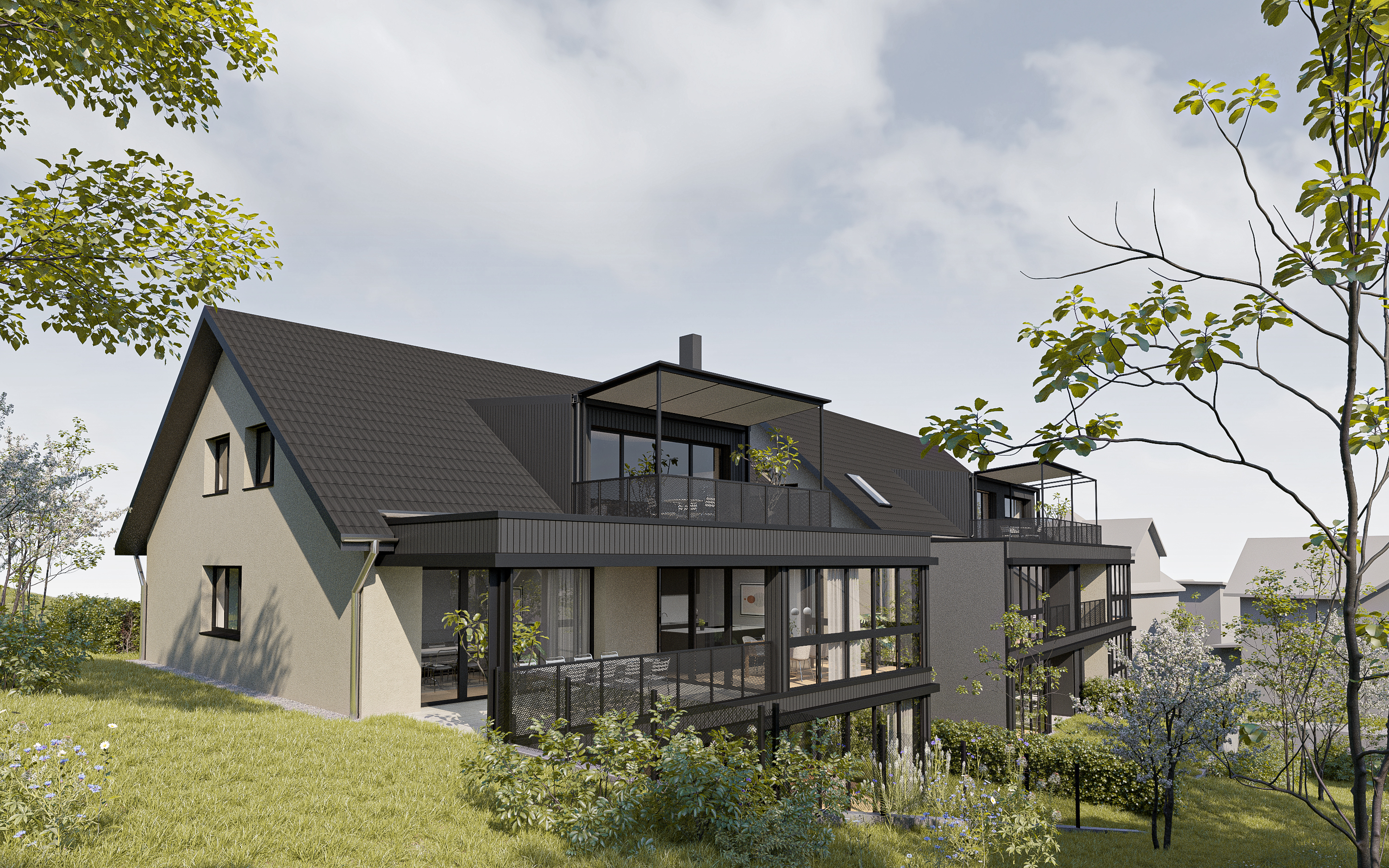 - Grosszügige, überdachte Terrassen mit integrierten Wintergärten für Wohnkomfort zu jeder Jahreszeit.